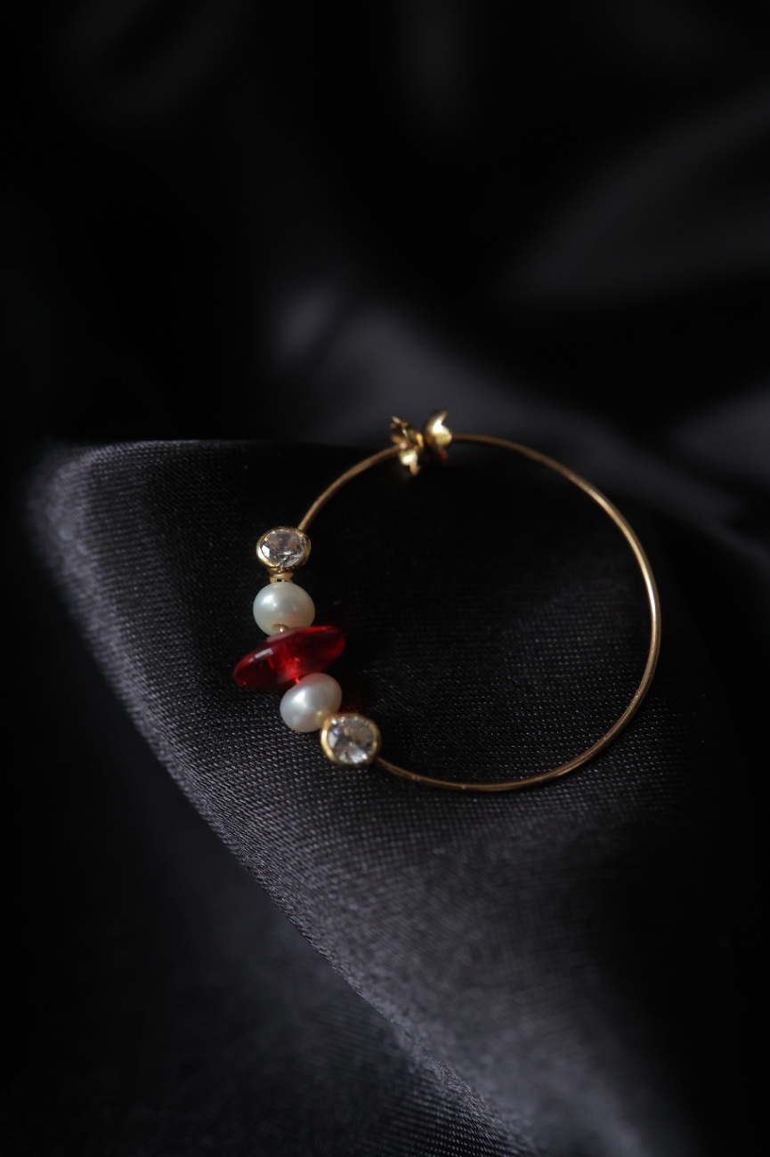 A traditional nose ring worn by Hindu brides from their wedding day onwards on all auspicious occasions. Features a pearl with a laldi (red ring gemstone), designed especially for those without a pierced nose