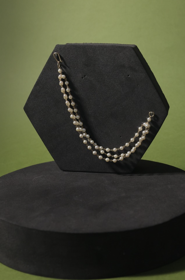 Gold kanoti crafted with three hand-stitched rows of pearls, intricately woven with gold wire