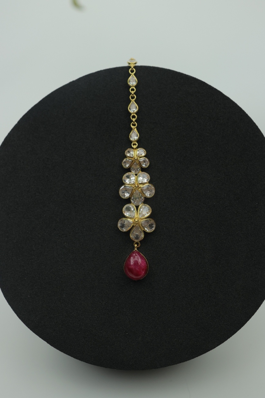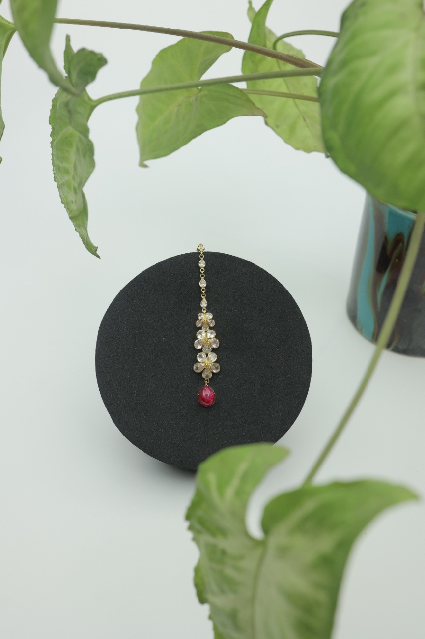 Gold mangtika adorned with Cubic Zirconia stones and featuring a pear-shaped ruby drop