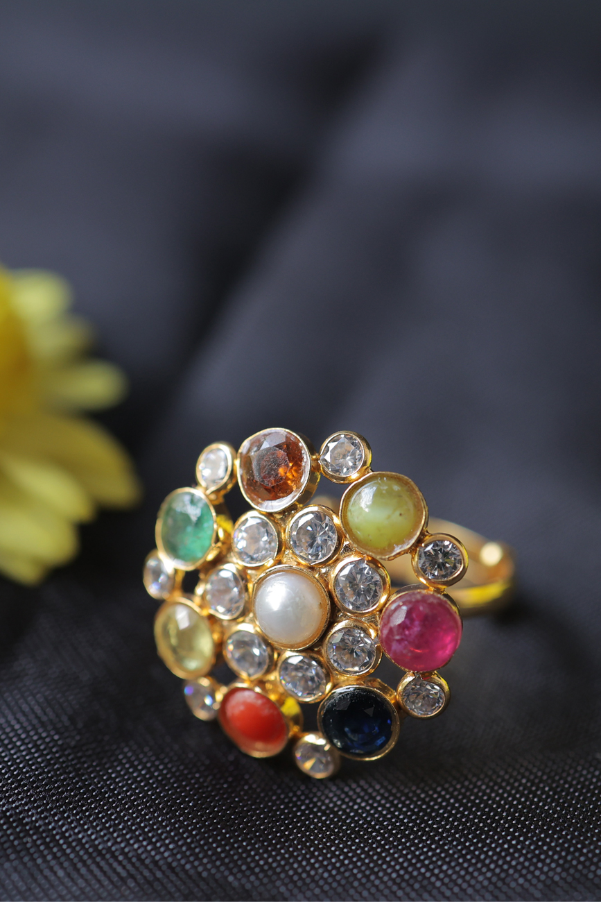 Size-adjustable gold ring adorned with Navratan gemstones and sparkling Cubic Zirconia stones