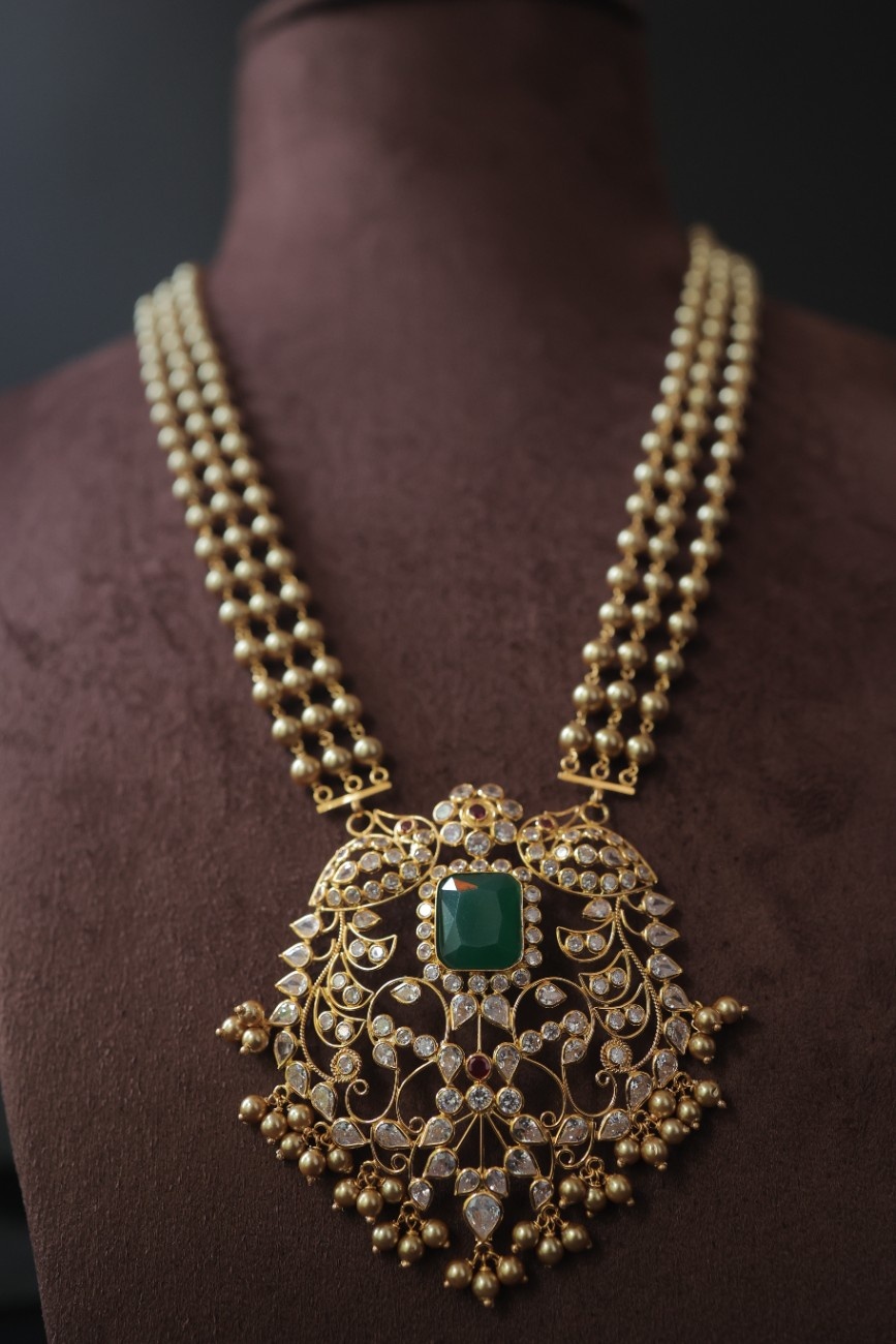 A gold necklace featuring green onyx, cubic zirconia, red gemstones, golden pearls, and a gold wire peacock design
